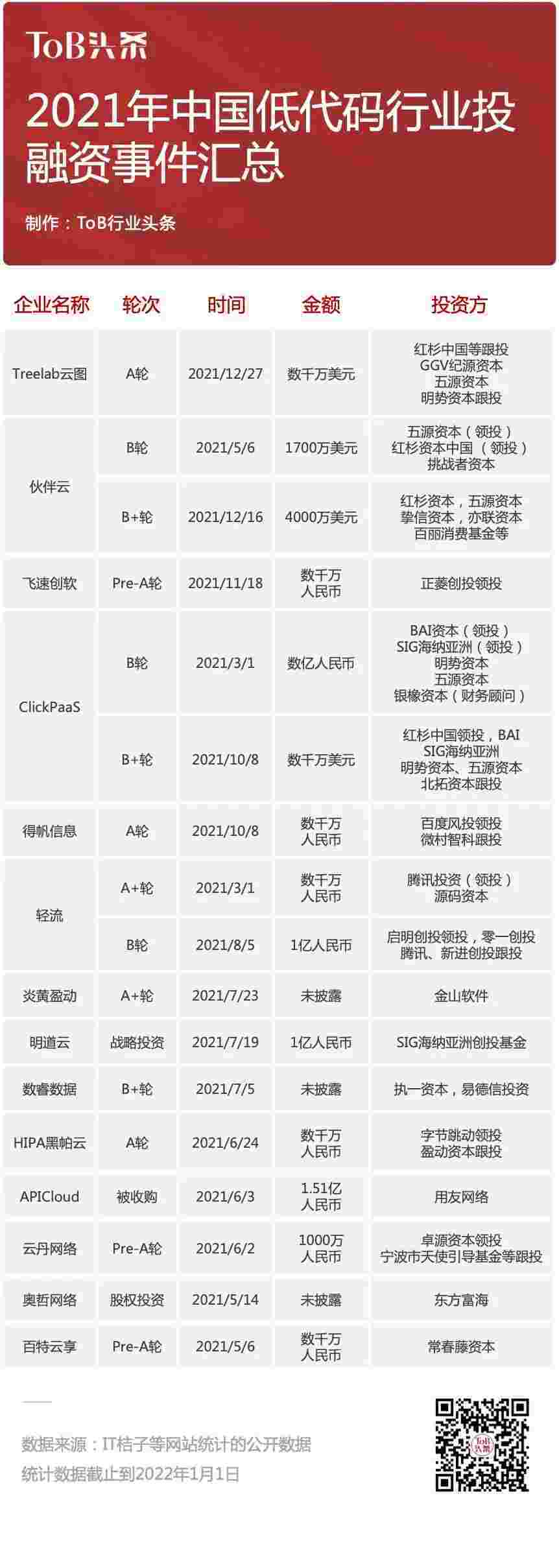 到2021年,,,无/低代码投融资规模势头更甚,,,其中包括轻流两轮融资(A+轮数千万人民币,,B轮近亿人民币)、、NO钱包 两轮融资(B轮数亿人民币,,,,B+轮数千万美元)、、百特云享数千万元Pre-A轮融资......