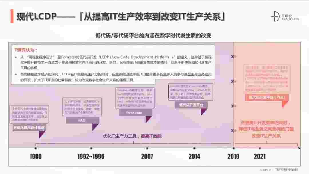 2020年前后,,,,源于提高IT工作者开发效能的LCDP不断进化和衍生,,面对业务导向日益明显的数字化变革。。LCDP衍生出了面向不同对象的升级服务——面向专业人群的LCDP和业务人群的NCDP,,,,LCDP与NCDP的不同服务属性被逐渐认可和接受。。 LCDP在提高IT开发效率的同时,,,降低IT与业务之间协同的门槛改变IT生产关系。。。。