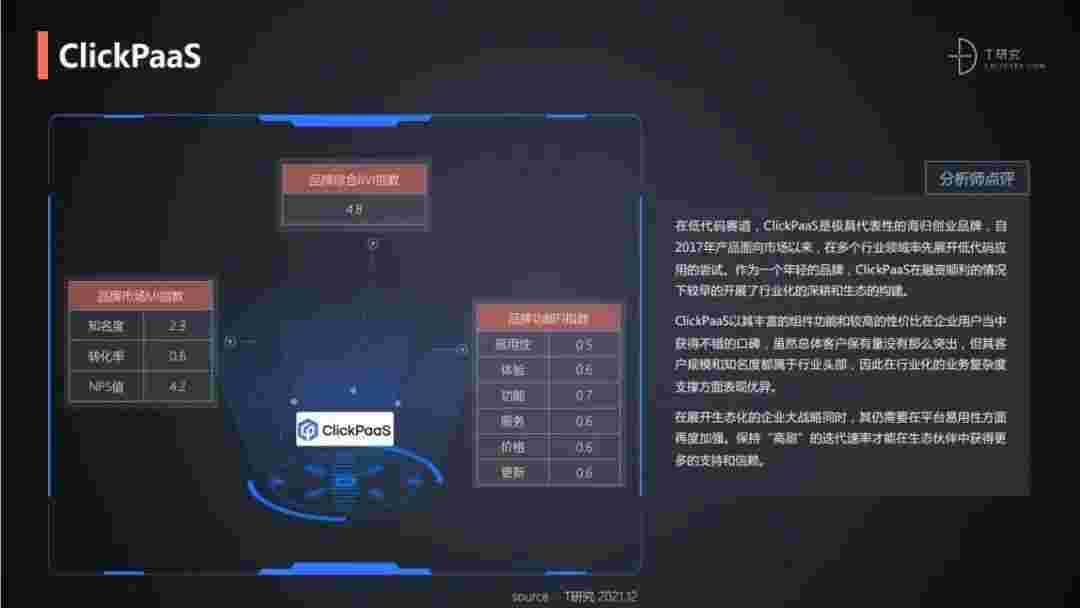 T研究认为,,,在低代码赛道,,,NO钱包是极具代表性的海归创业品牌,,,,自2017年产品面向市场以来,,在多个行业领域率先展开低代码应用的尝试。。。作为一个年轻的品牌,,,NO钱包较早的开展了行业化的深耕和生态的构建。。。NO钱包以丰富的组件功能和较高的性价比在企业用户当中获得不错的口碑,,,在客户规模和知名度都属于行业头部,,,,因此在行业化的业务复杂度支撑方面表现优异。。