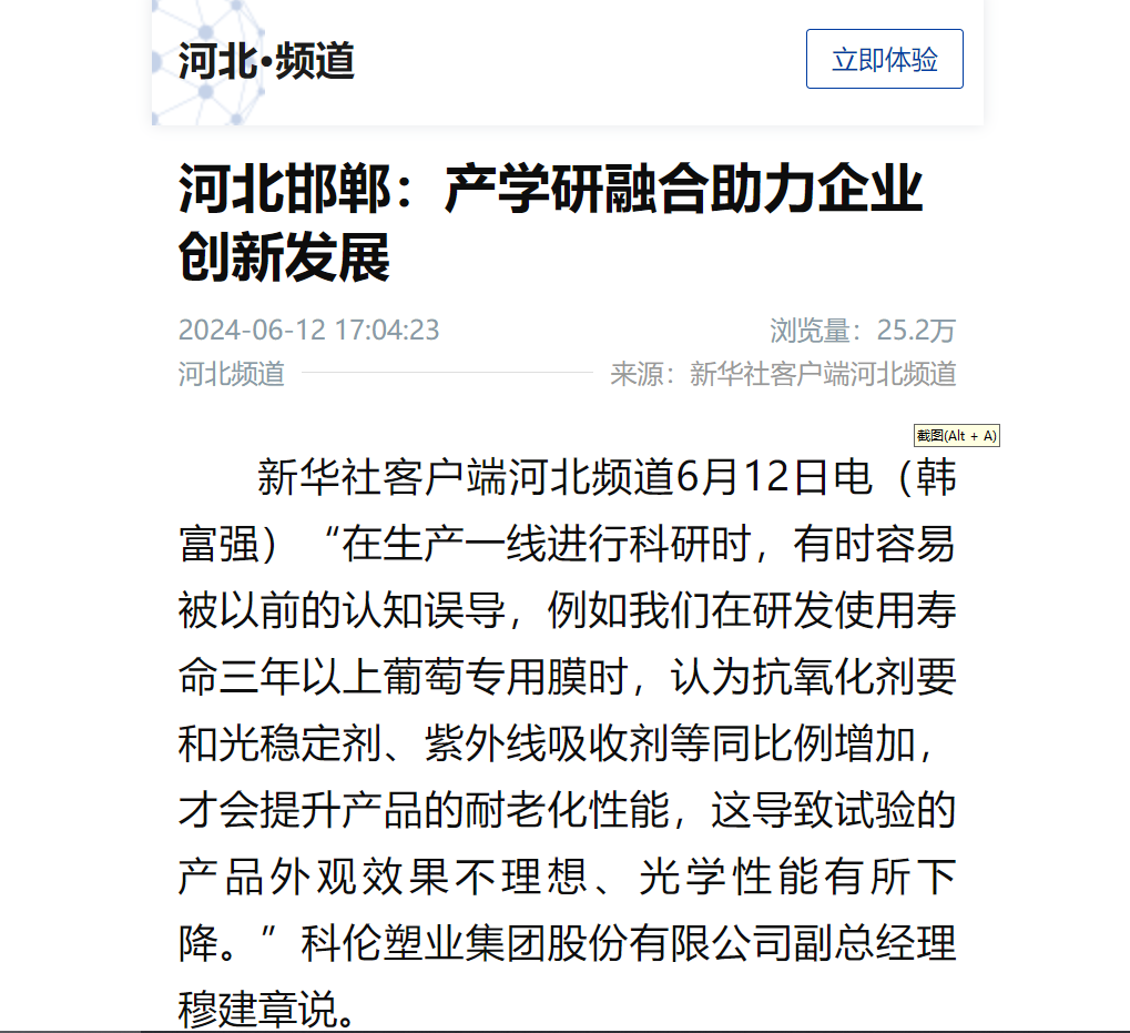 尊龙凯时人生就是赢塑业集团股份有限公司于2024年6月12日就公司成长历程、产学研融合助力企业创新发展方面,公司副总经理穆建章接受新华社河北分社采访,报道详情如下